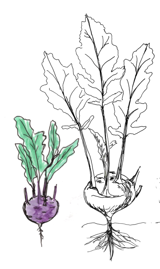 Der Kohlrabi ist deine Vitaminbombe. Auch in den Blättern sind Vitamine, besonders Vitamin A. Viel gießen, damit er nicht holzig wird.