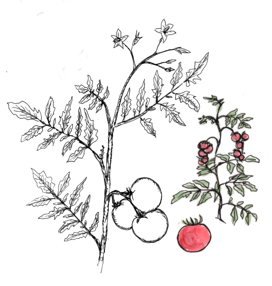 Tomaten sind wärmeliebend und freuen sich über Schutz. Bestäubt werden die Blüten von Hummeln. Nur mit warmen Wasser gießen und nicht zu späte wegen Krautfäule. Tagetes als Nachbarn schützen die Wurzeln der Tomaten vor Fadenwürmern im Boden, den Nematoden. Es gibt Fleischtomaten, Coctailtomaten, Strauchtomaten und auch wilde Formen. Helle Tomaten reifen im Zimmer nach. Tomaten brauchen einen Stab und Verzweigungen werden regelmößig abgebrochen (ausgegeizt).