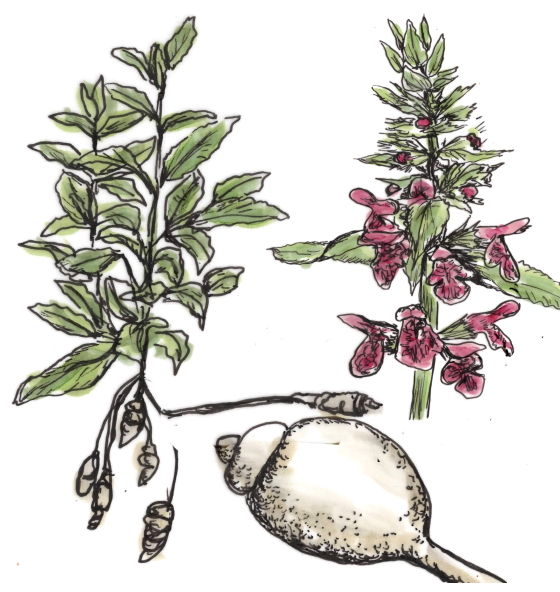 Knollenziest ist eine krautige Pflanze, die bis 1 Meter hoch wird, ursprünglich aus China kommt und hier kaum blüht. Die Knöllchen werden bei Temperaturen um 15 °C gebildet: bei uns erst im September.